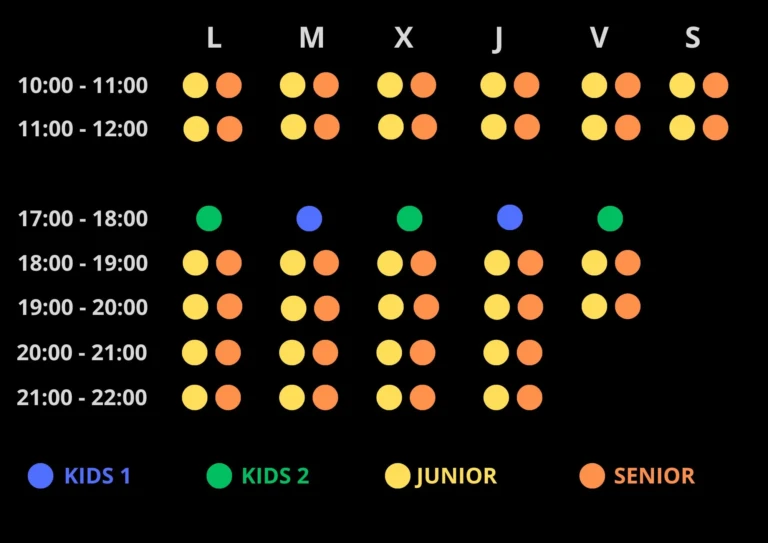 Los horarios de las sesiones de entrenamiento dirigidos, están distribuidos en 4 grupos según edades.