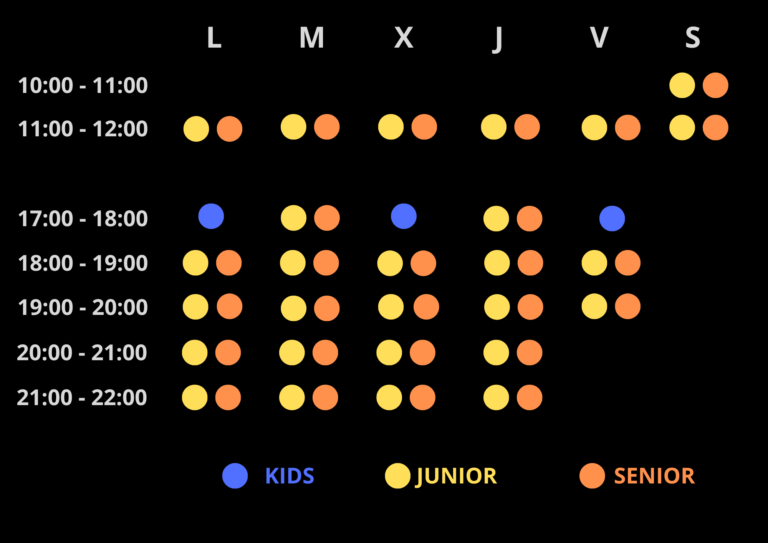 Los horarios de las sesiones de entrenamiento dirigidos, están distribuidos en 4 grupos según edades.